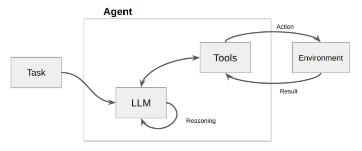 例えば、下に示すReAct Agentのアーキテクチャでは、LLMがタスクを受け取り、内省的に推論したうえで、必要に応じて外部ツールの呼び出すプロセスが定義されています。